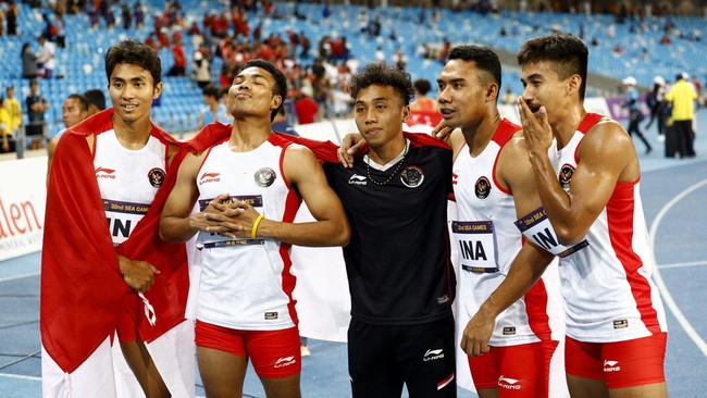 Tim estafet putra Indonesia secara luar biasa meraih medali emas 4x100 meter SEA Games 2023 dengan mengalahkan Thailand di Morodok Techo National Stadium, Phnom Penh, Rabu (10/5).